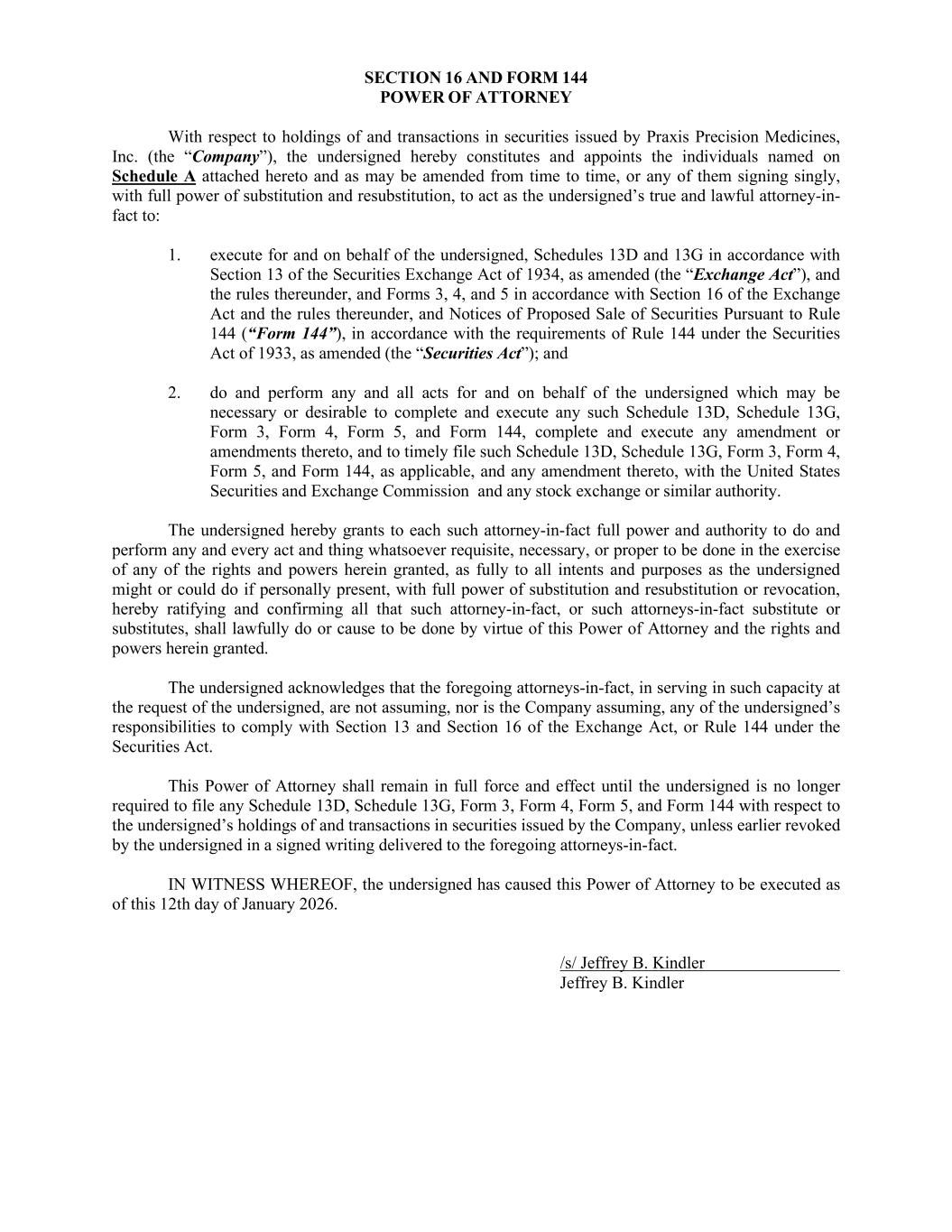 SECTION 16 AND FORM 144 POWER OF ATTORNEY With respect to holdings of and transactions in securities issued by Praxis Precision Medicines, Inc. (the “Company”), the undersigned hereby constitutes and appoints the individuals named on Schedule A attached hereto and as may be amended from time to time, or any of them signing singly, with full power of substitution and resubstitution, to act as the undersigned’s true and lawful attorney-in- fact to: 1. execute for and on behalf of the undersigned, Schedules 13D and 13G in accordance with Section 13 of the Securities Exchange Act of 1934, as amended (the “Exchange Act”), and the rules thereunder, and Forms 3, 4, and 5 in accordance with Section 16 of the Exchange Act and the rules thereunder, and Notices of Proposed Sale of Securities Pursuant to Rule 144 (“Form 144”), in accordance with the requirements of Rule 144 under the Securities Act of 1933, as amended (the “Securities Act”); and 2. do and perform any and all acts for and on behalf of the undersigned which may be necessary or desirable to complete and execute any such Schedule 13D, Schedule 13G, Form 3, Form 4, Form 5, and Form 144, complete and execute any amendment or amendments thereto, and to timely file such Schedule 13D, Schedule 13G, Form 3, Form 4, Form 5, and Form 144, as applicable, and any amendment thereto, with the United States Securities and Exchange Commission and any stock exchange or similar authority. The undersigned hereby grants to each such attorney-in-fact full power and authority to do and perform any and every act and thing whatsoever requisite, necessary, or proper to be done in the exercise of any of the rights and powers herein granted, as fully to all intents and purposes as the undersigned might or could do if personally present, with full power of substitution and resubstitution or revocation, hereby ratifying and confirming all that such attorney-in-fact, or such attorneys-in-fact substitute or substitutes, shall lawfully do or cause to be done by virtue of this Power of Attorney and the rights and powers herein granted. The undersigned acknowledges that the foregoing attorneys-in-fact, in serving in such capacity at the request of the undersigned, are not assuming, nor is the Company assuming, any of the undersigned’s responsibilities to comply with Section 13 and Section 16 of the Exchange Act, or Rule 144 under the Securities Act. This Power of Attorney shall remain in full force and effect until the undersigned is no longer required to file any Schedule 13D, Schedule 13G, Form 3, Form 4, Form 5, and Form 144 with respect to the undersigned’s holdings of and transactions in securities issued by the Company, unless earlier revoked by the undersigned in a signed writing delivered to the foregoing attorneys-in-fact. IN WITNESS WHEREOF, the undersigned has caused this Power of Attorney to be executed as of this 12th day of January 2026. /s/ Jeffrey B. Kindler Jeffrey B. Kindler