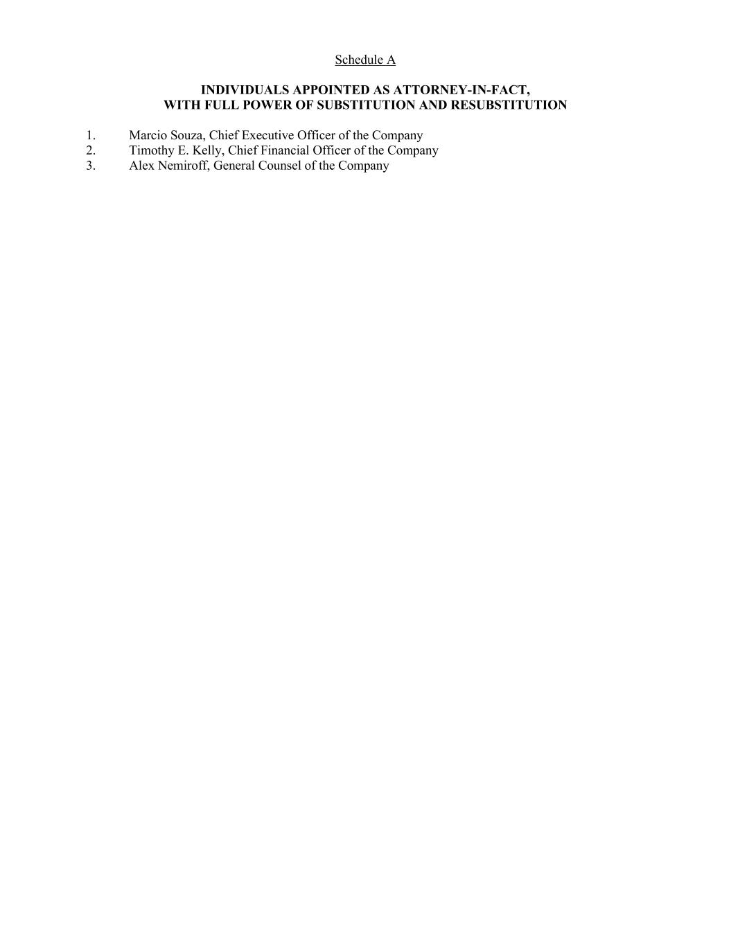 Schedule A INDIVIDUALS APPOINTED AS ATTORNEY-IN-FACT, WITH FULL POWER OF SUBSTITUTION AND RESUBSTITUTION 1. Marcio Souza, Chief Executive Officer of the Company 2. Timothy E. Kelly, Chief Financial Officer of the Company 3. Alex Nemiroff, General Counsel of the Company